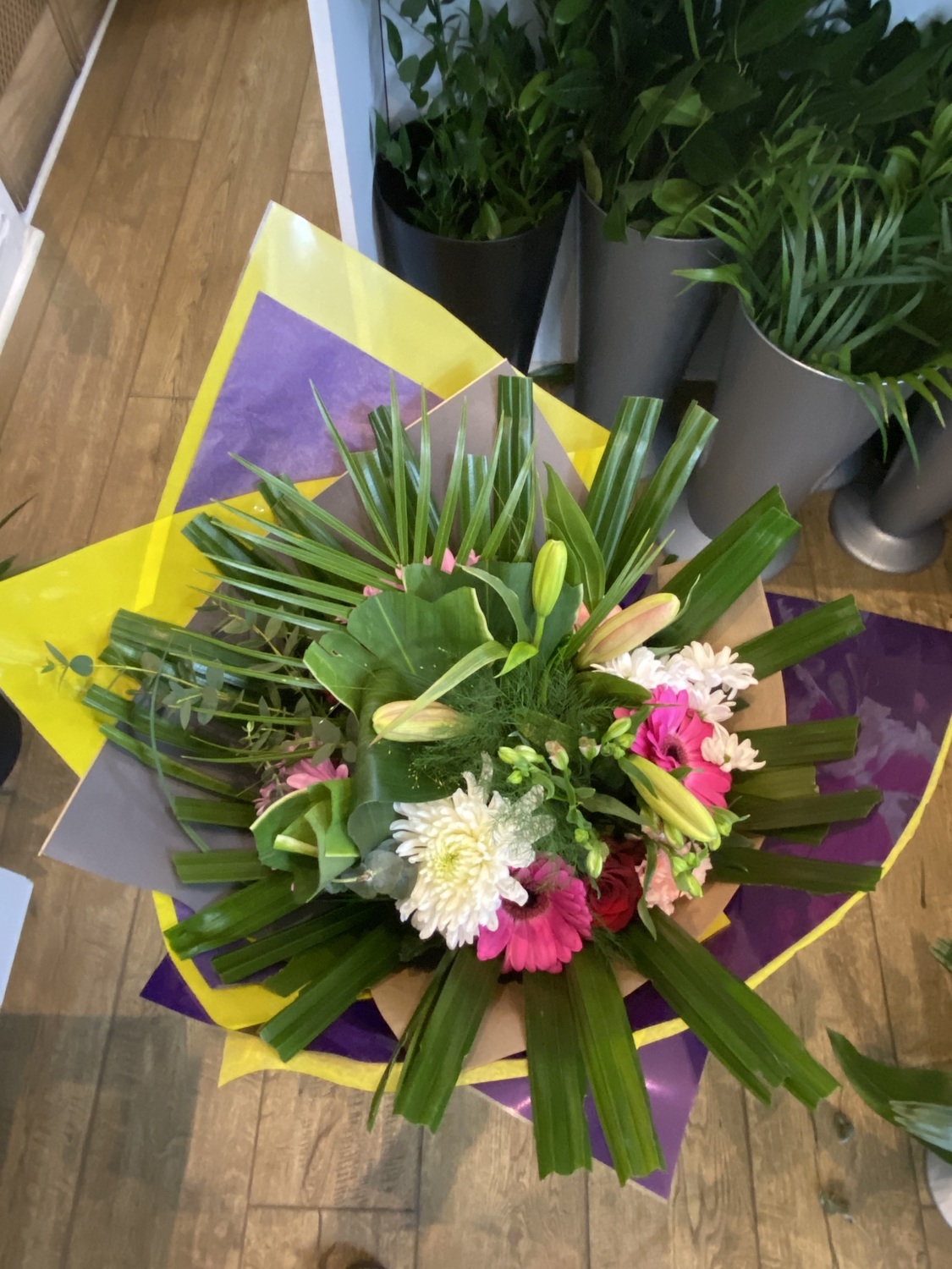 In this superior bouquet you have roses, carnations, lily, big blooms, anthurium, palm, lizzy, alstromeria, foliage and much more.