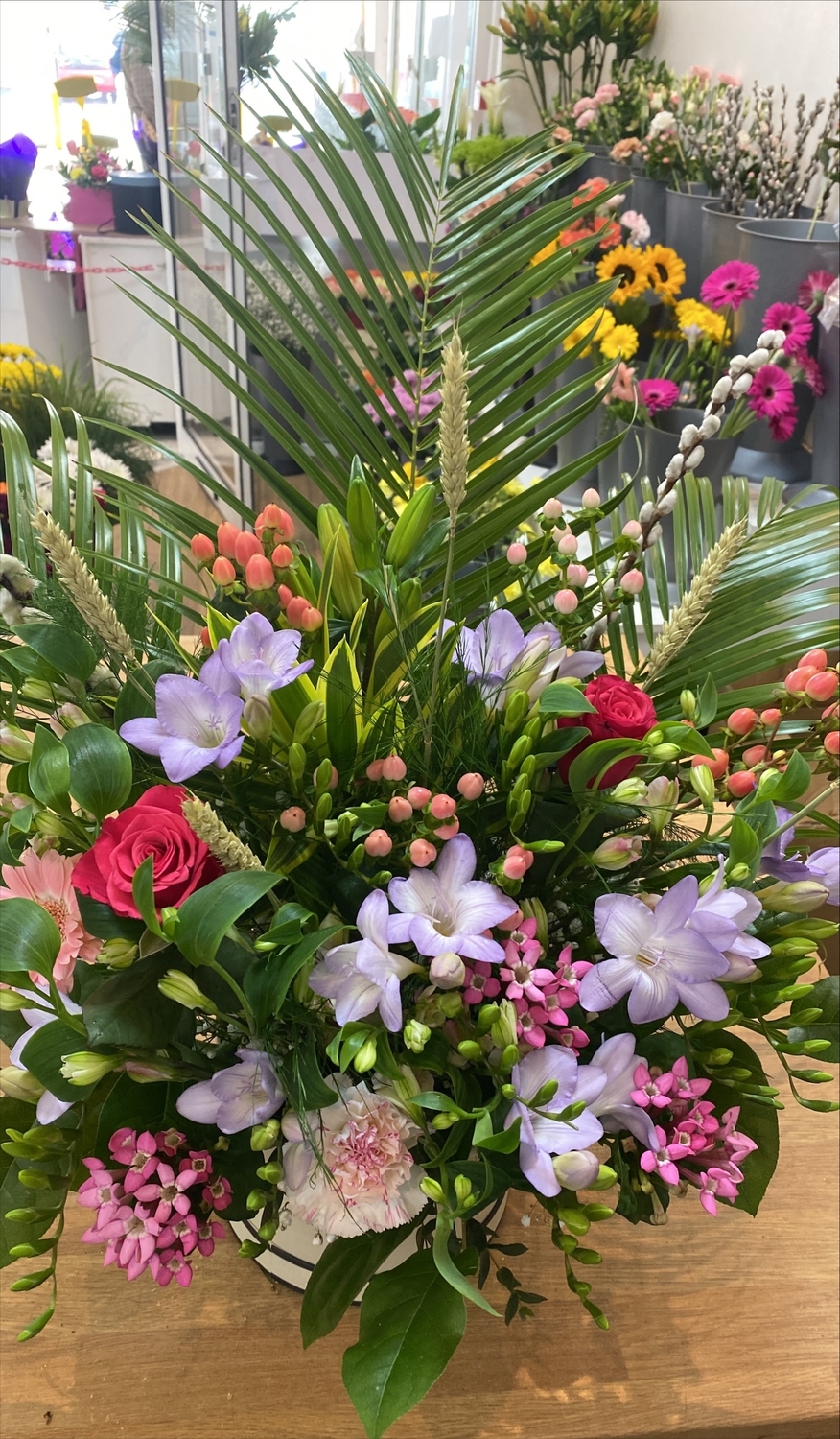 This is an example of our NEW boxed spring medow arrangement.. Already in water so the person receiving your wonderful gift can just display their wonderful flowers in the home. The only flower care is add water daily.