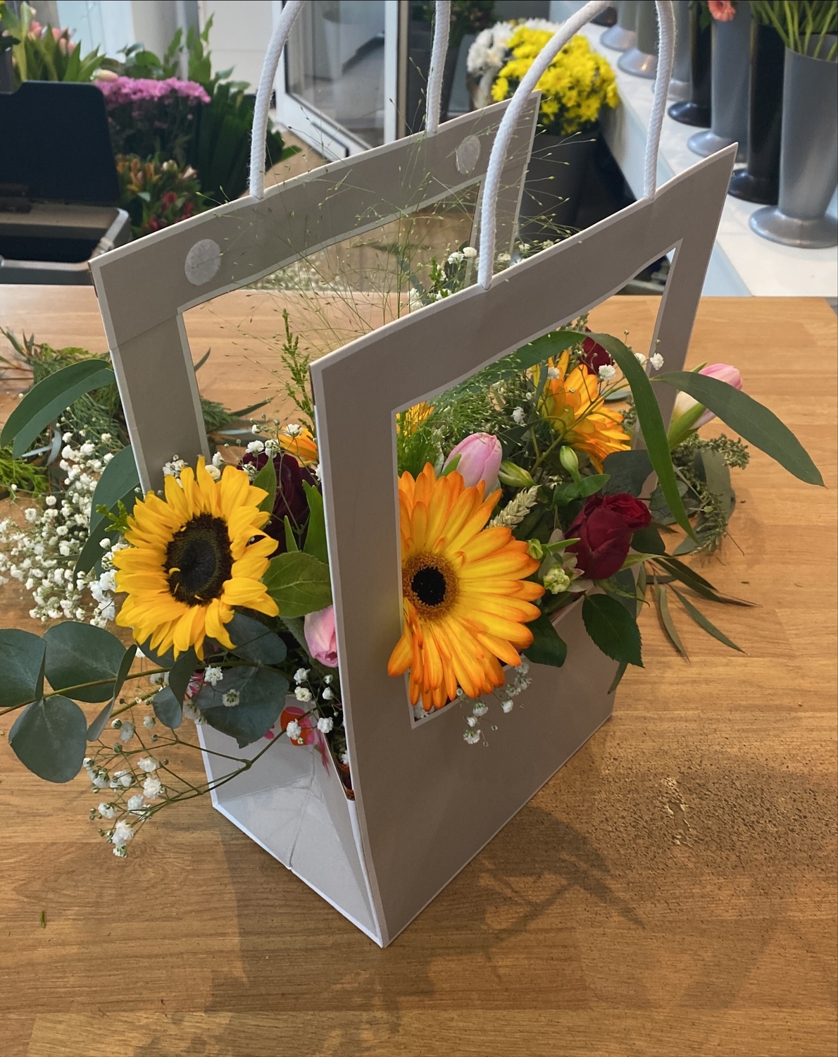 The sunshine rich in yellow and oranges carrier comes in own water carrier with no spills & all you do is water daily straight into the carrier. No further work required. This item is left in the carrier & requires daily water by the the person receiving the gift. NO VASE REQUIRED.