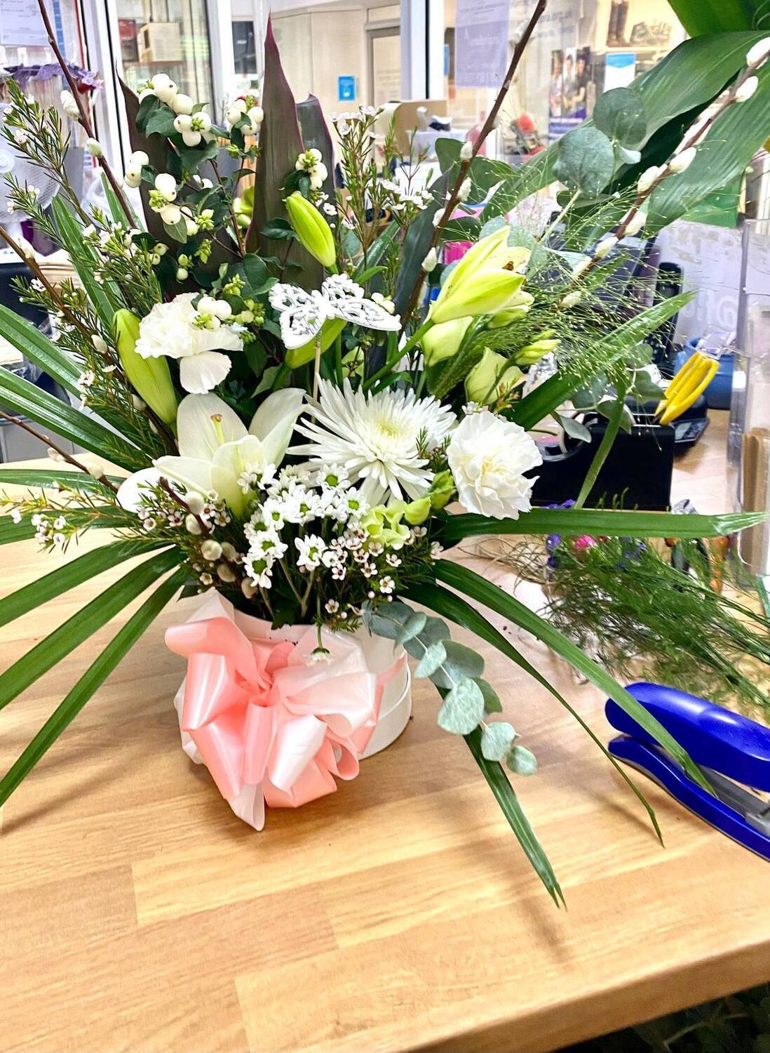 This elegant floral arrangement for Mothers Day come with oriental lily's large blooms, carnations, aspi leaf, fountain grasses, lizzy all in neutrals.